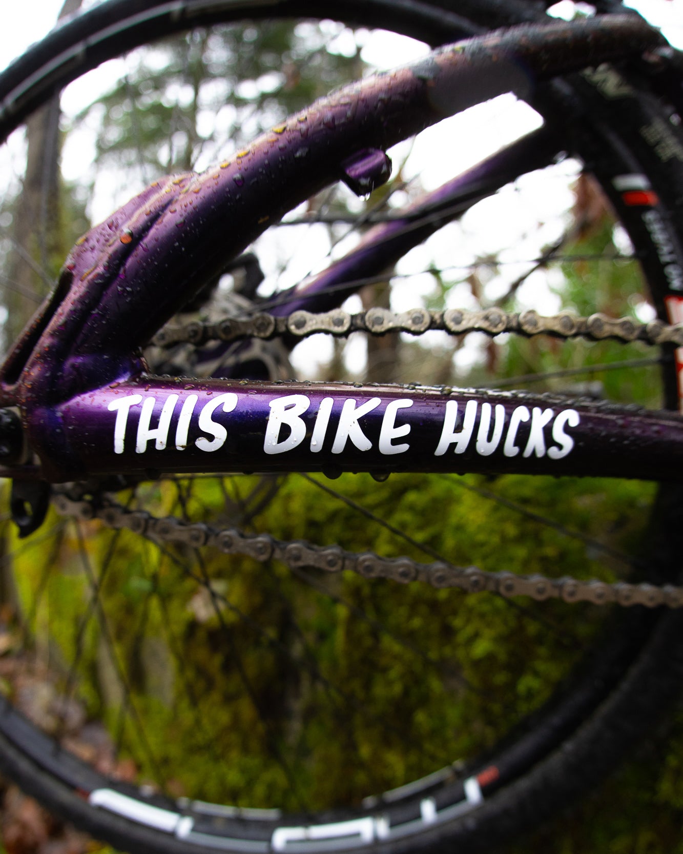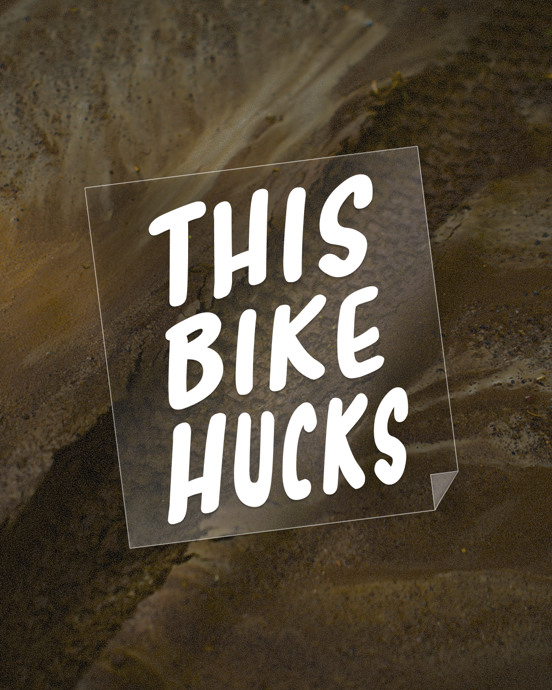 - 1 x This Bike Hucks Vertical Sticker (1.3" x 1.6") [White]